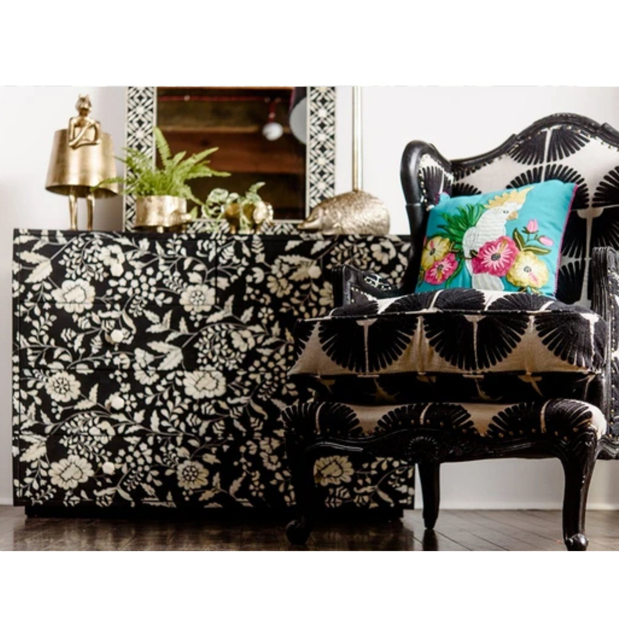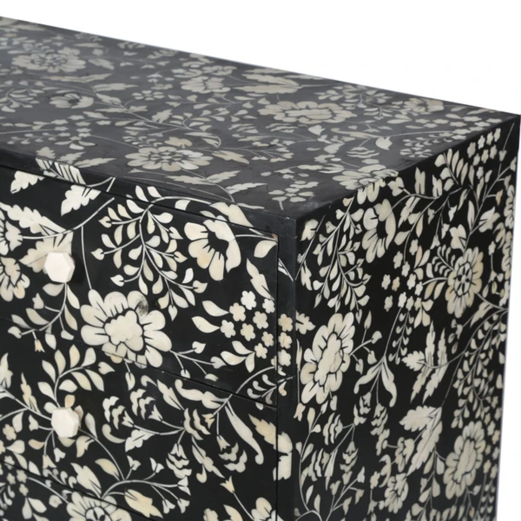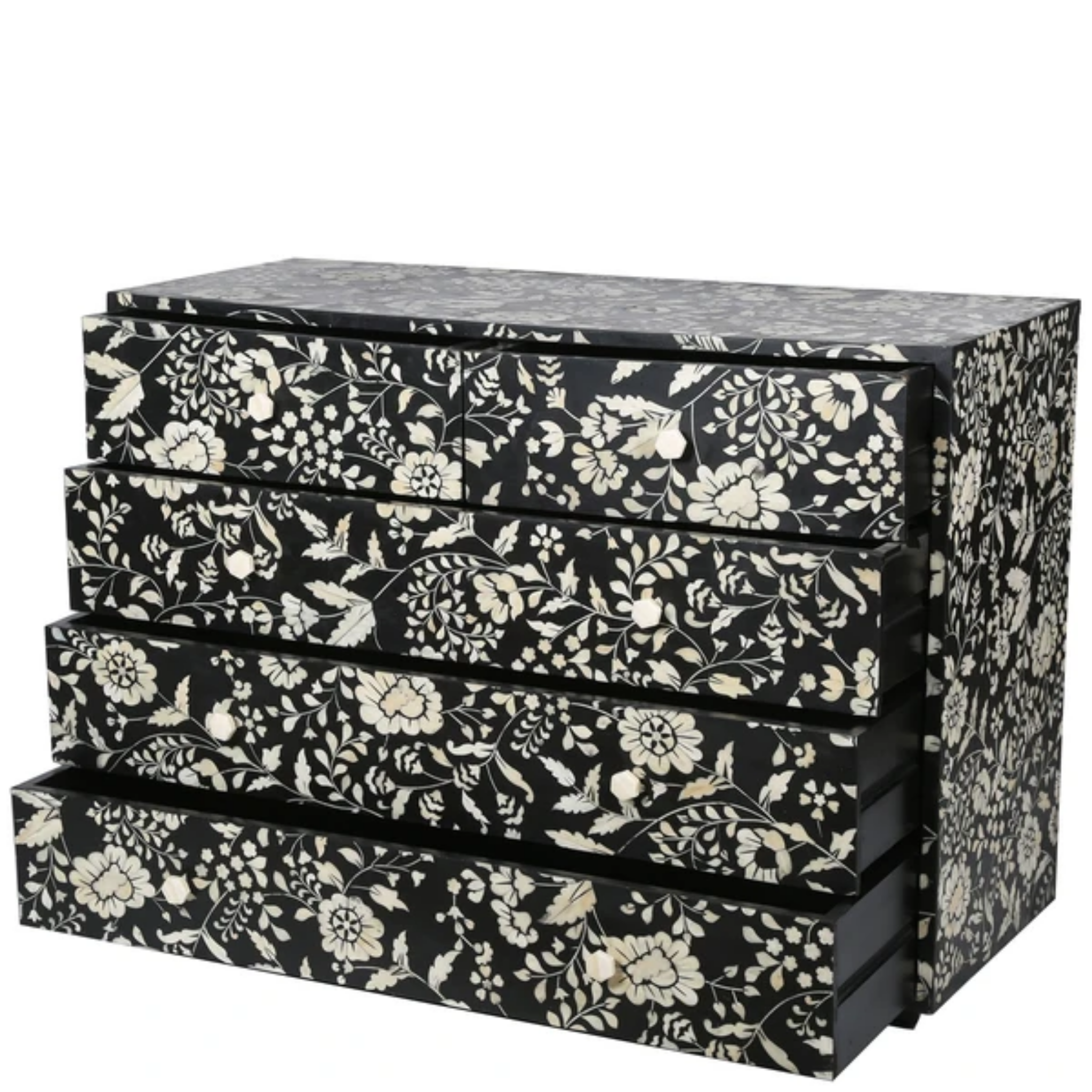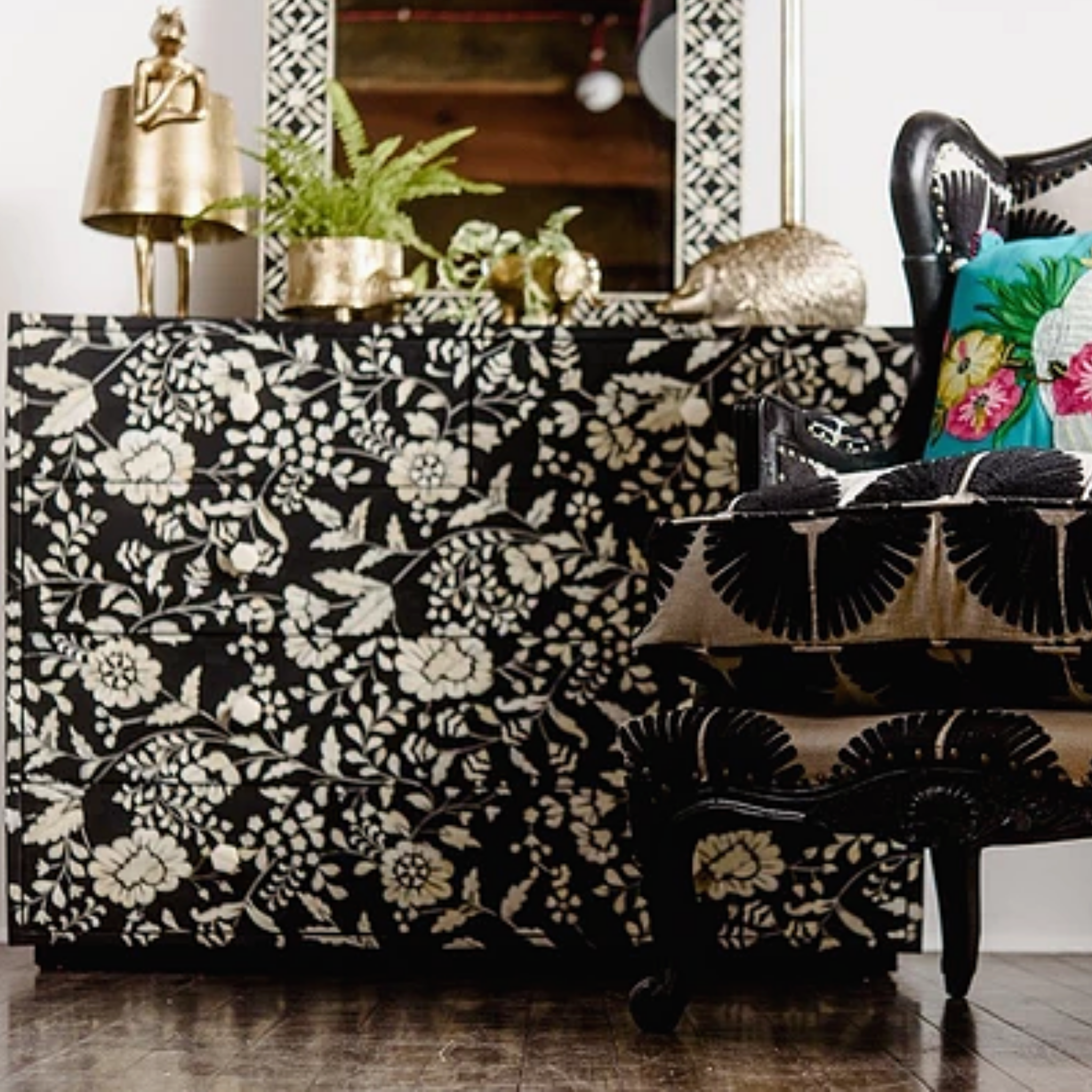 The art of bone inlay is specific to the region of Udaipur in India, where this meticulous skill is handed down from generation to generation. Working in the family home, three craftsmen are involved. The first hand-carves camel bone into delicate shapes; the second affixes those pieces onto a wooden furniture frame in intricate patterns; The third fills in around the bone with coloured resin background. The process takes many weeks to complete.