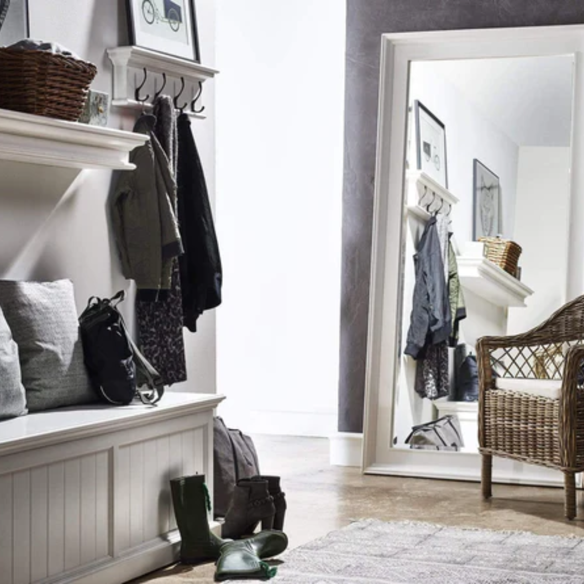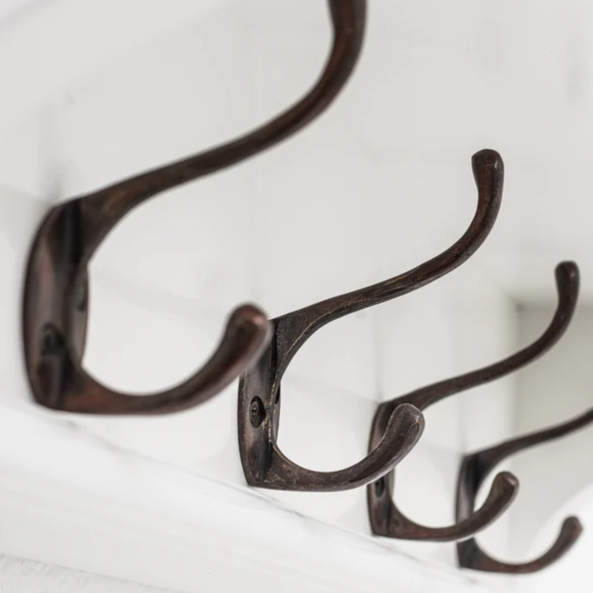 Large coat hooks, with an antique brass finish, provide a home for your coat, scarf, hat or bag.