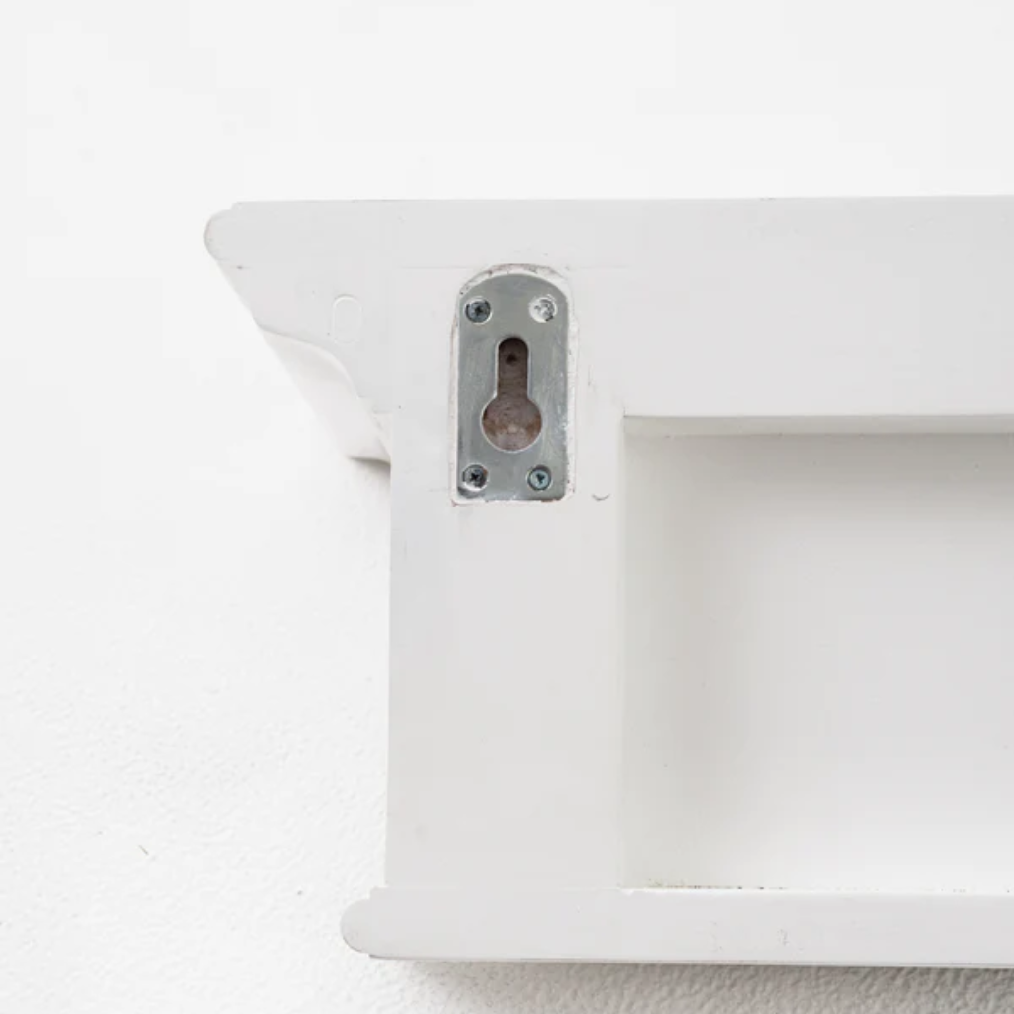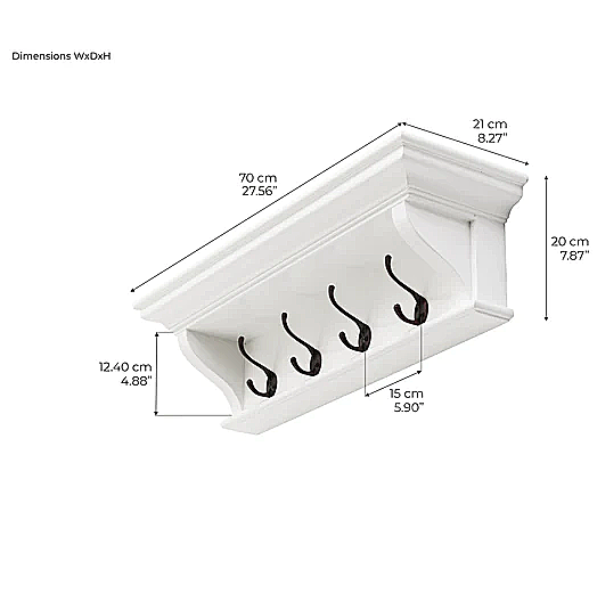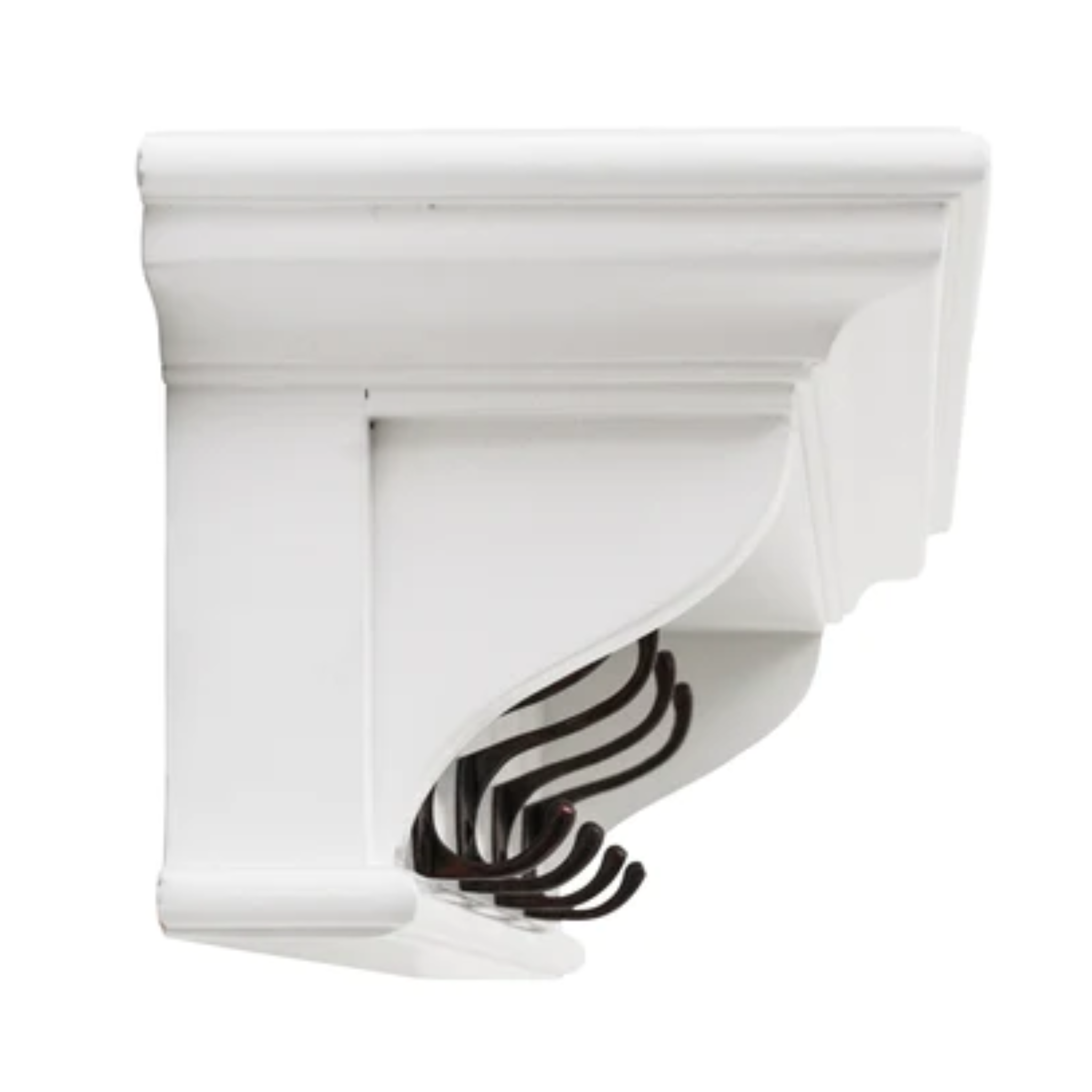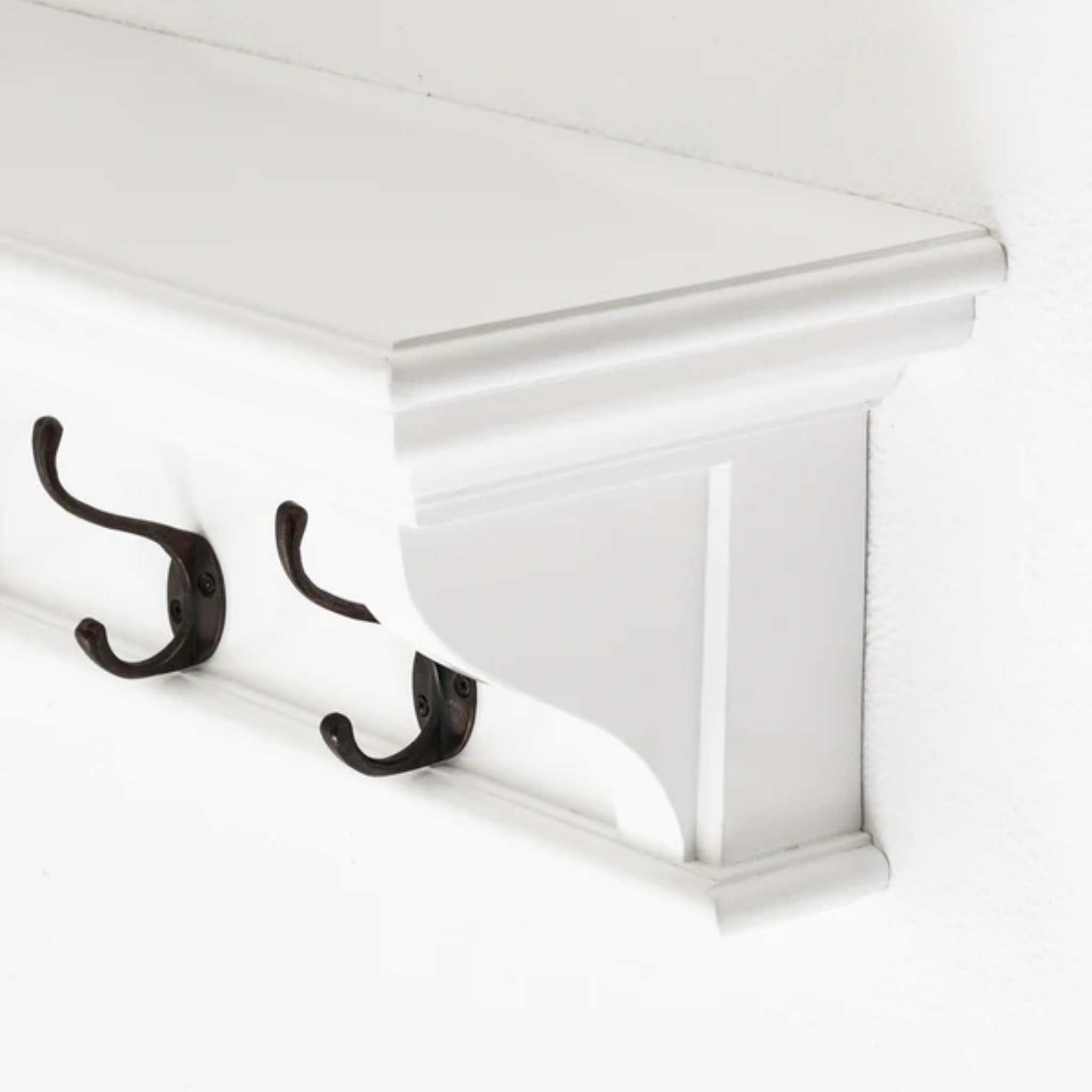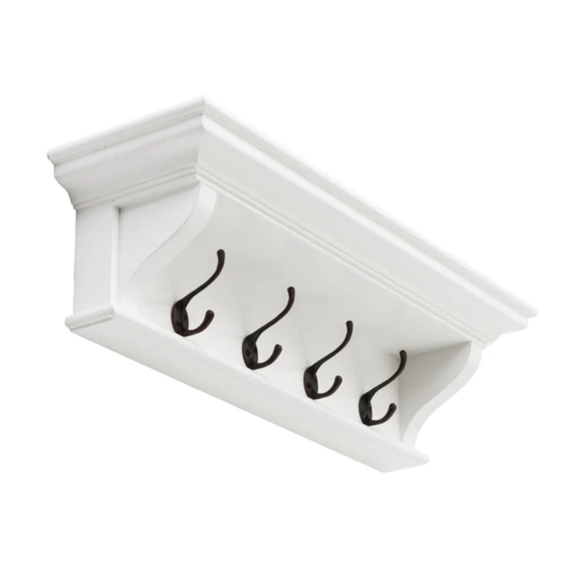 Add some flair with this cleverly designed coat rack. A small shelf has been incorporated into the crown molding, as a spot to display your decorative wares.