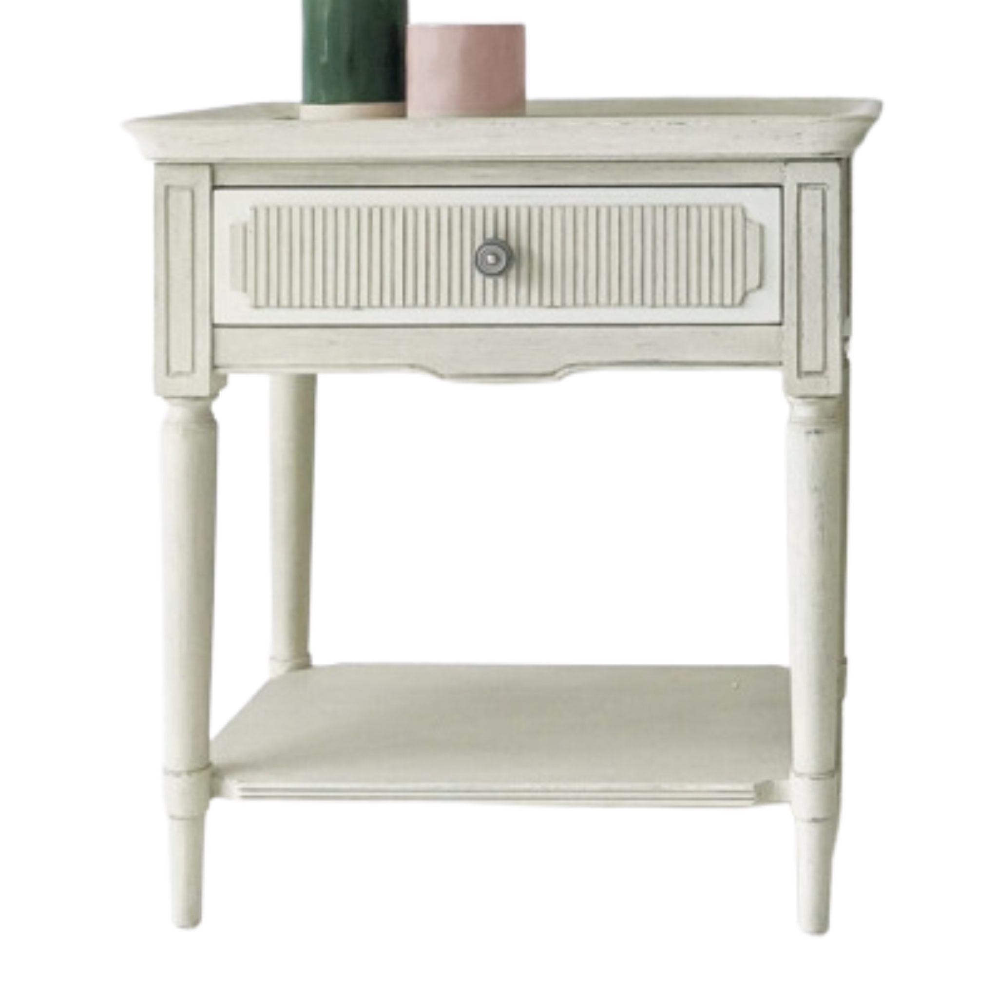 The single drawer presents fluted detailing, and a lower shelf provides additional storage. The drawer is finished with a recycled metal pull handle. The bedside table is hand-finished in a distressed artisanal patina of French fawn and antique stone.