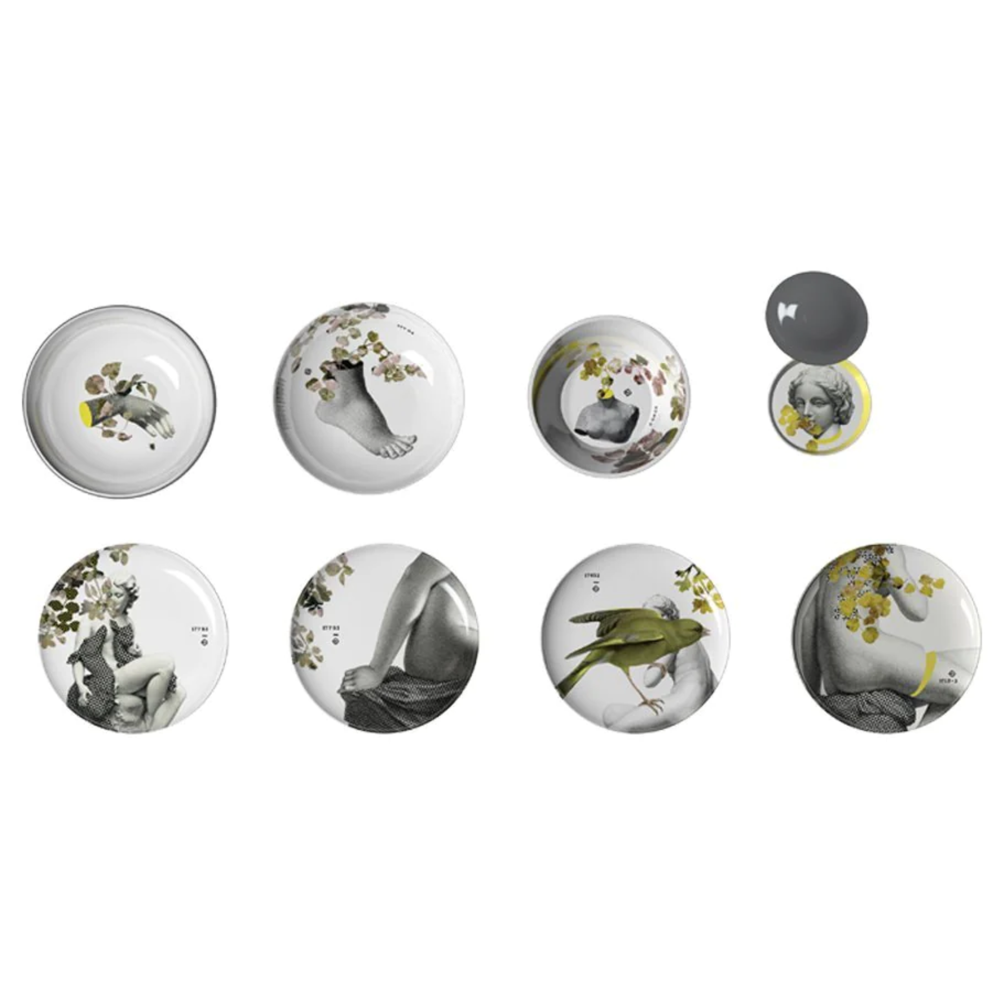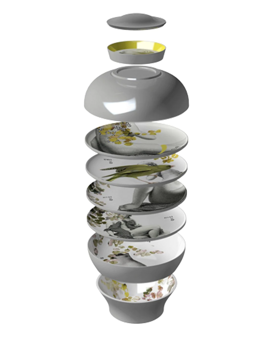 Once separated, the subtle dishware container, made up of plates and salad bowls, indeed reveals a bucolic path to take the guests on a ride. Immortal statues and antique beauties from the park are featured here, the vestiges of a black and white world, slowly colonized by the colors of an almighty nature.